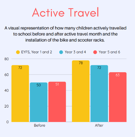 To encourage active travel, we ran competitions to see which class could walk, cycle, or scoot to school the most. New bike and scooter racks were installed so pupils could travel actively with confidence, knowing their belongings were safe. Following Walk to School Week, there was an 11.5% increase in active travel, with around 155 pupils travelling actively every day.