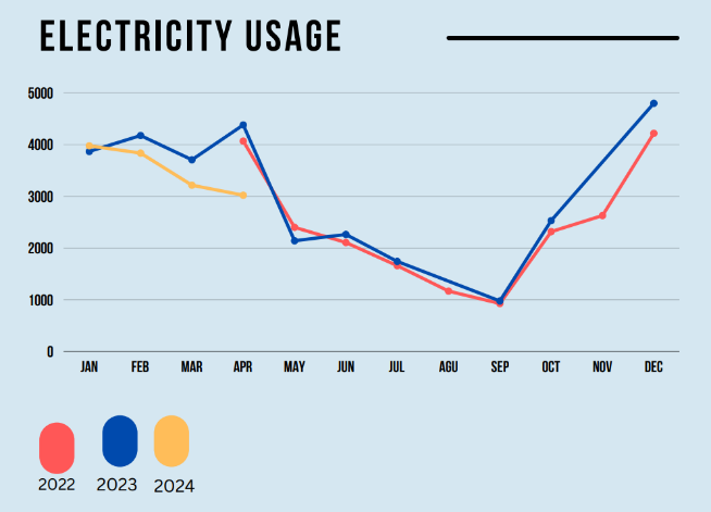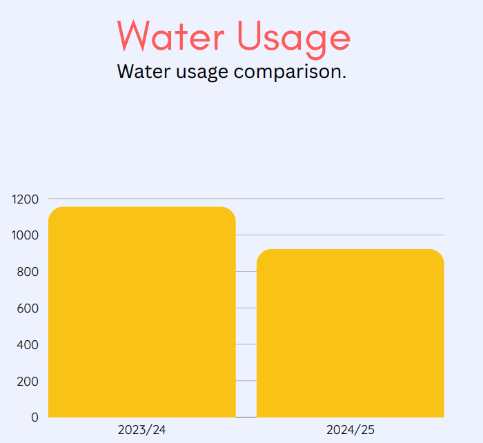 Motion-sensor lights were installed across the school so that lights automatically switch off when rooms are empty. Reminder posters were placed in rooms without sensors to encourage energy-saving habits. Our 109 solar panels continued to provide a significant reduction in electricity use, and around 240 energy-saving devices are now in use across the school. Overall, these efforts saved approximately 1,237 kilowatts of energy compared to the previous year.